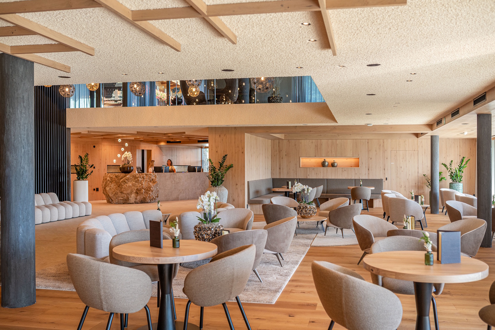 Die neue Bar und die stilvolle Weinlounge unterstreichen den Anspruch, Begegnungsräume zu schaffen. Hier trifft man sich auf ein Glas Wein und ein anregendes Gespräche. Mit raffiniert gesetzten Lichtakzenten und einladenden Sitzmöglichkeiten ist das der perfekte Ort für einen Aperitif oder einen Drink nach dem Dinner. Auch der Restaurantbereich wurde teilweise umgestaltet. Ein Show-Cooking Bereich und viel Raum für kulinarische Inszenierungen machen den Aufenthalt zu einem Erlebnis. So wird Essen zum Erlebnis und die Verbindung von regionalen Zutaten und internationaler Kreativität sichtbar. Die großzügige Terrasse mit ihren Loungenischen eröffnet den Panoramablick auf die Dolomiten. Jeder Platz ist dabei ein Logenplatz.