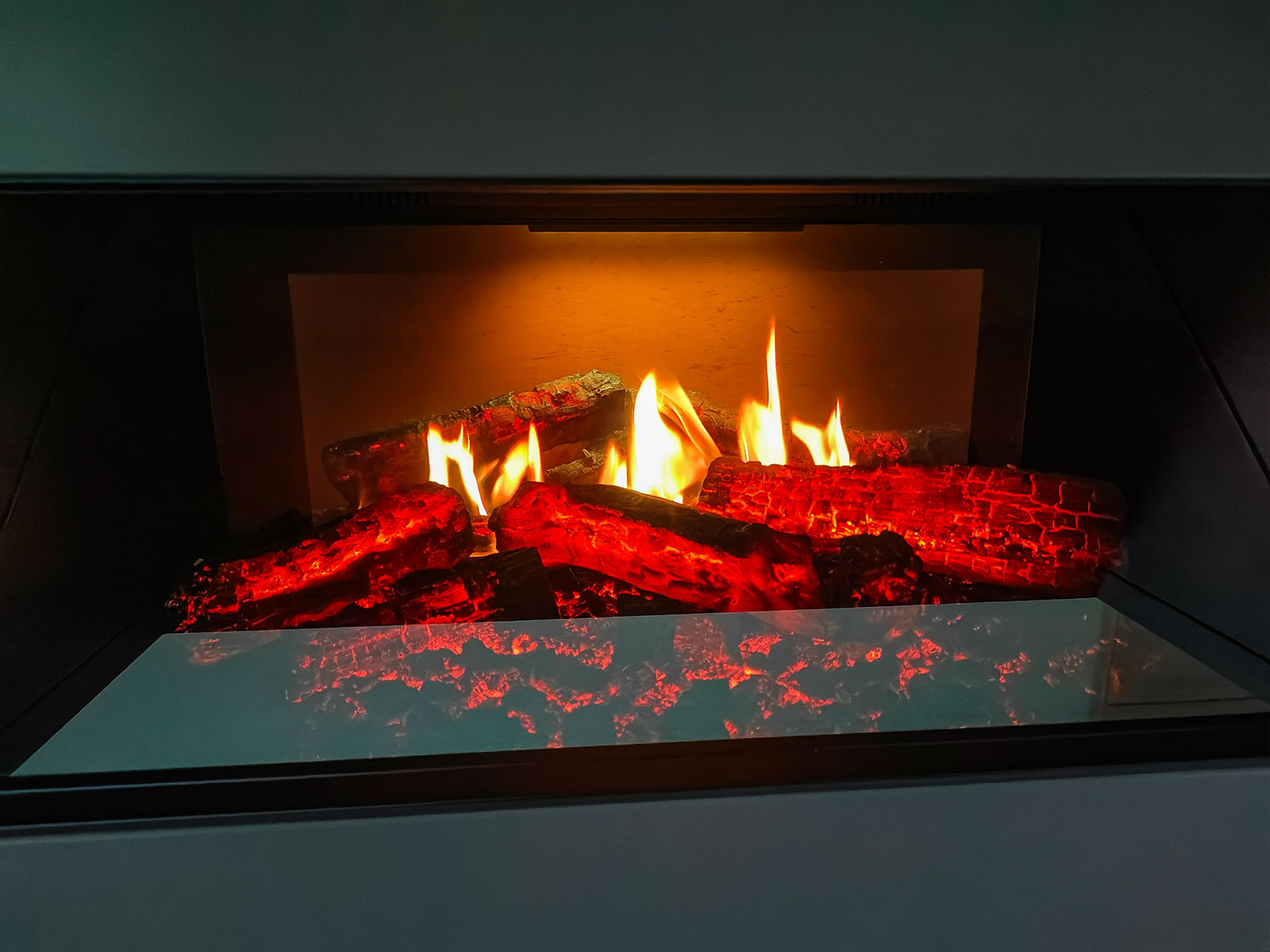 Ein großer Fernseher ist ebenso im Zimmer wie ein elektrischer Kamin, der das Flackern eines echten Kamins zeigt und so für ein kuscheliges Ambiente sorgt.