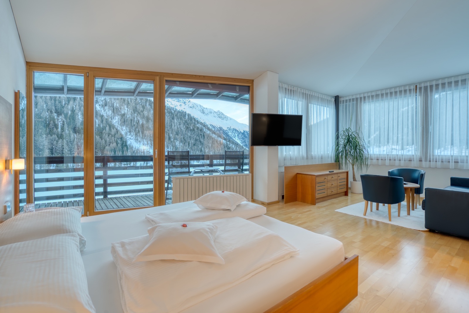 Auch im Inneren setzt das Hotel Cevedale auf Ruhe und Gemütlichkeit. Holz, Naturstein und liebevolle Details schaffen eine Atmosphäre der Geborgenheit. Alle Zimmer und Suiten sind zur Sonnenseite ausgerichtet und öffnen den Blick auf die umliegende Bergwelt. Das Hotel Cevedale lädt dazu ein, den Winter noch einmal intensiv zu erleben: mit Sonne im Gesicht, Ruhe im Herzen und Zeit füreinander.