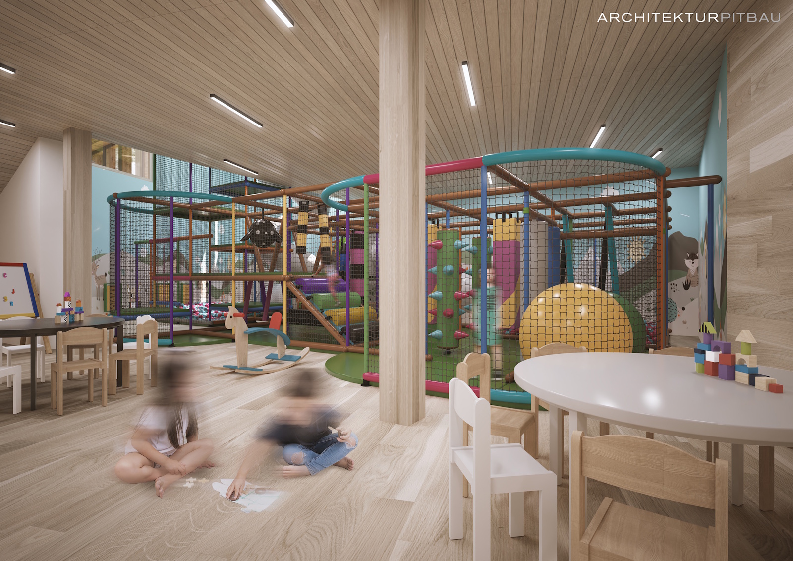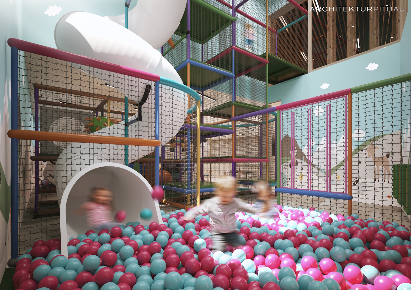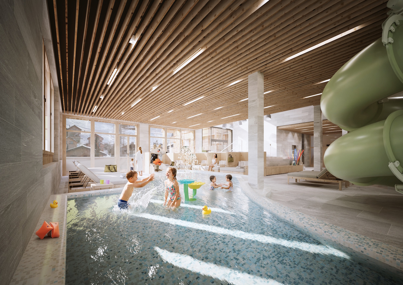 Für die jüngsten Gäste entstehen dabei eigene Erlebniswelten im Wasser: separate Kinderbereiche laden zum spielerischen Entdecken ein, während eine integrierte Wasserrutsche den Poolbereich zu einem lebendigen Treffpunkt für kleine Abenteurer macht.