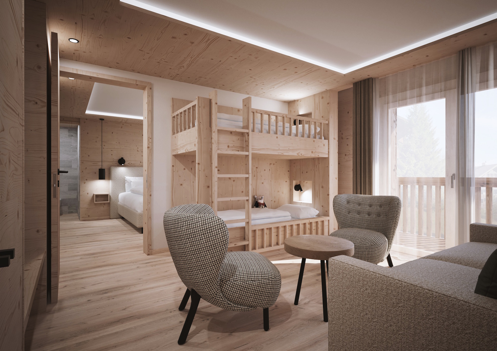 Was sich im Gesamtkonzept zeigt, wird auch im Detail spürbar. So wurde der Wohnkomfort gezielt weitergedacht: Die neuen Zimmer sind hochwertig mit Naturholz gestaltet, größtenteils mit eigenem Kinderzimmer konzipiert und mit praktischer Baby- und Kleinkindausstattung versehen. Es entstehen Rückzugsorte, in denen sich Familien vom ersten Moment an zuhause fühlen.