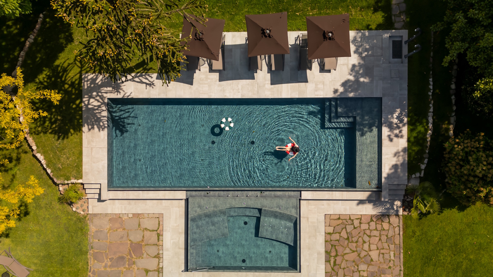 An sonnigen Sommertagen wird der Schlossgarten zur privaten Oase. Unter alten Bäumen, begleitet vom Zirpen der Zikaden, genießen Gäste entspannte Stunden am Außenpool oder lassen sich auf einer Liege von der südlichen Leichtigkeit des Seins tragen.